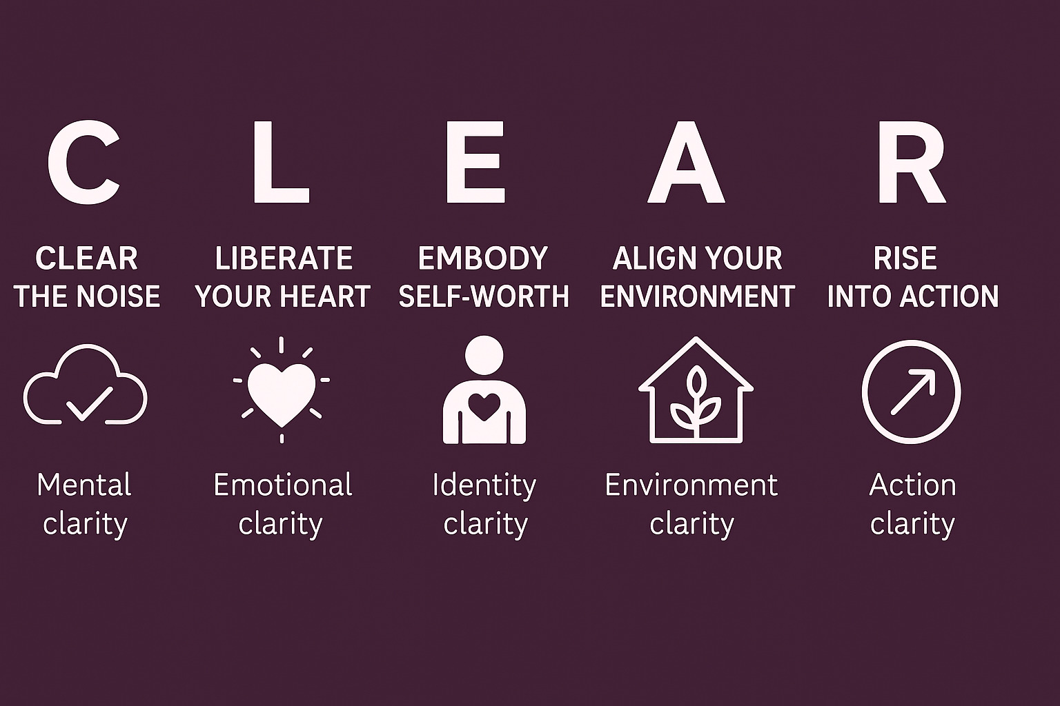 Each step, you’ll move through one layer of clarity — mental, emotional, identity, environment, and action — following the CLEAR Framework.